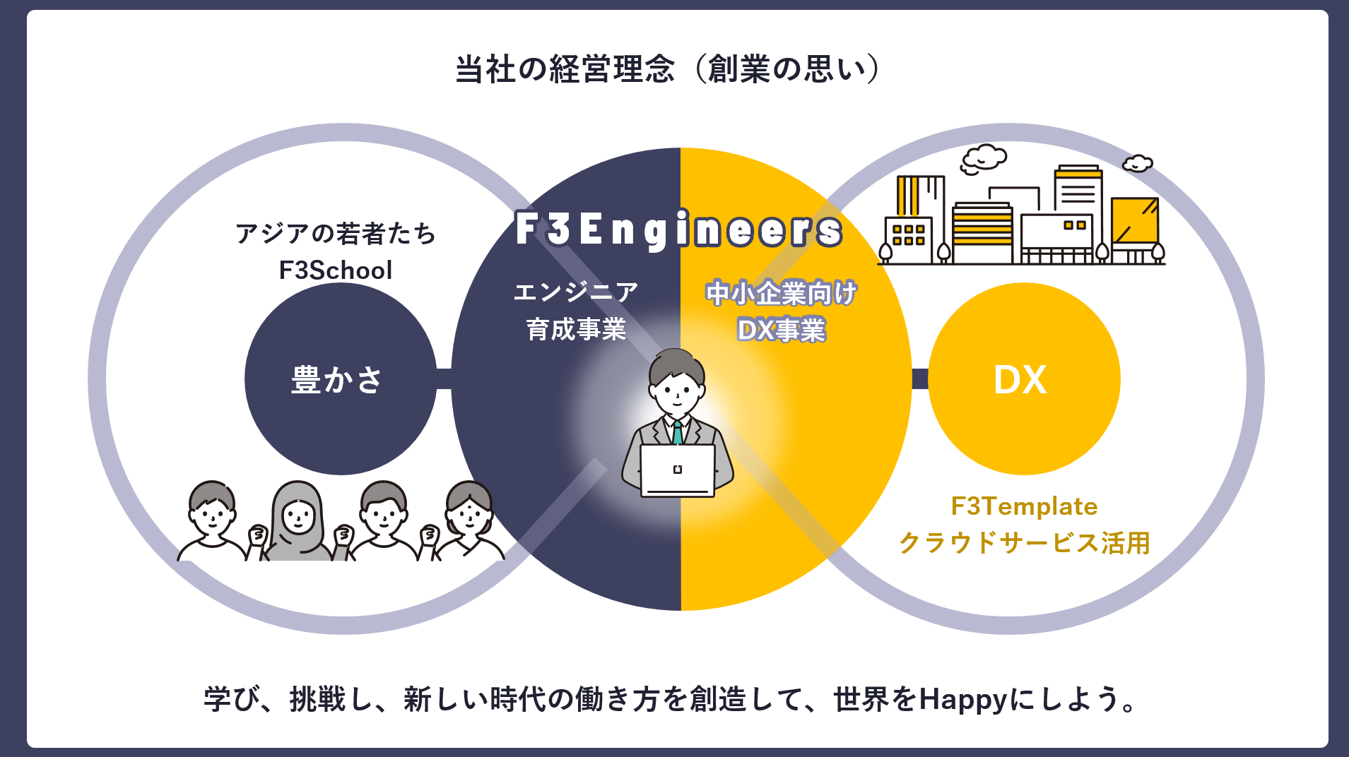 私たちF3Engineersは、お客様のシステム部門としての立場で、システム導入や運用を支えたいと願っています。 会社や組織といった古い価値観のボーダーラインを超えて、自分の家族や友人のように、その会社のDX推進を支援したい。 その先には、必ず成功したDX推進の状況が訪れると信じています。