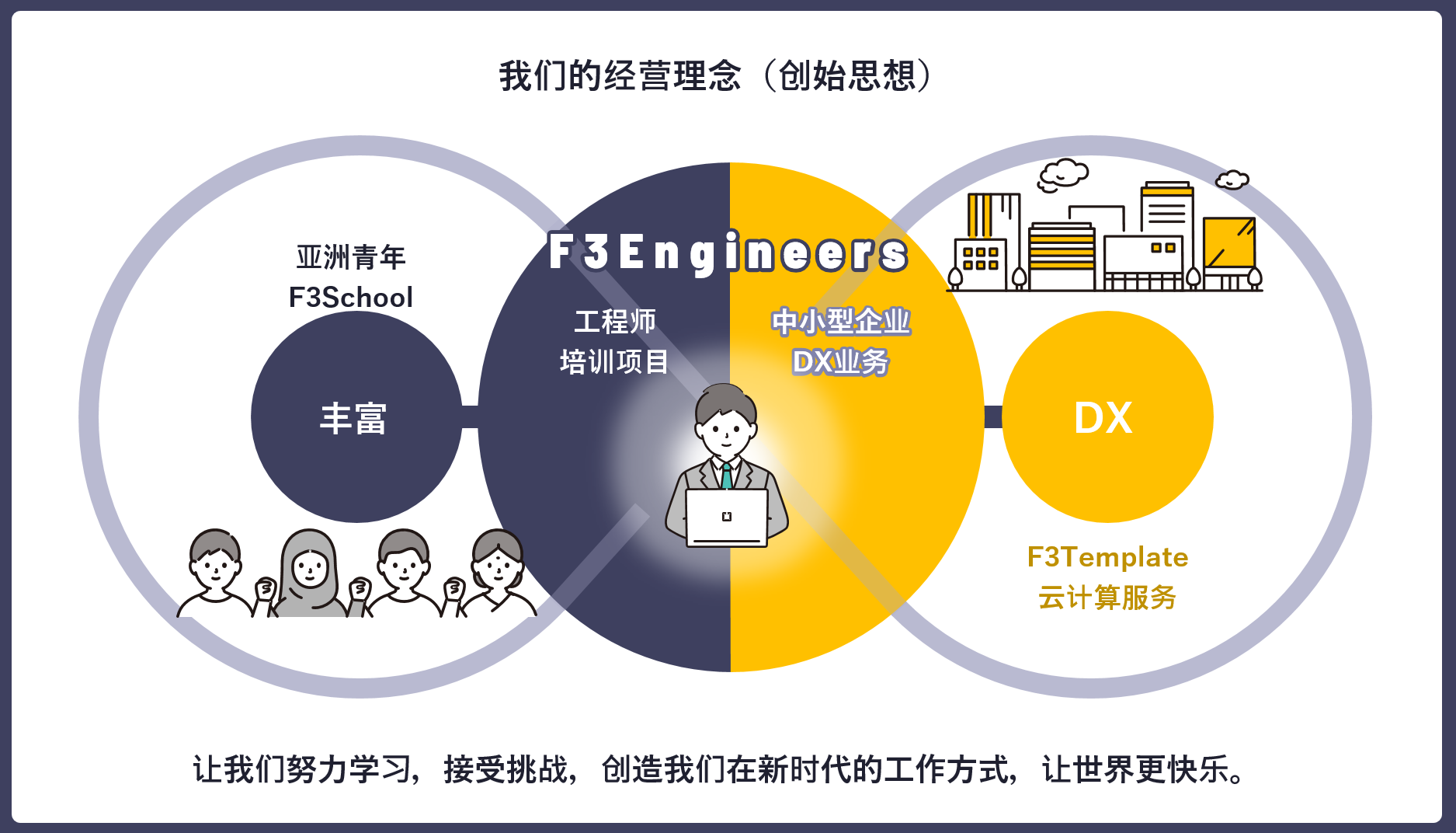在F3Engineers,我们愿意作为客户的系统部门,全⼒⽀持系统的引⼊和运维。我们希 望超越传统公司或组织的界限,像对待家⼈和朋友⼀样,助⼒他们的DX之旅。我们坚信,这将最终带来成功的DX实施。