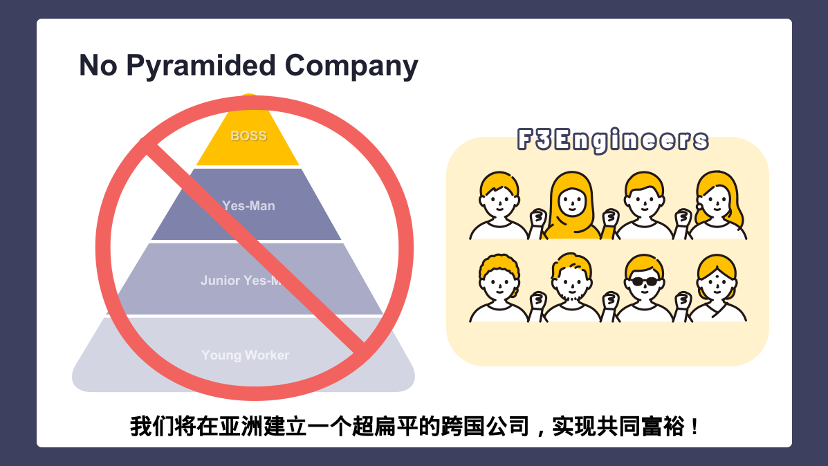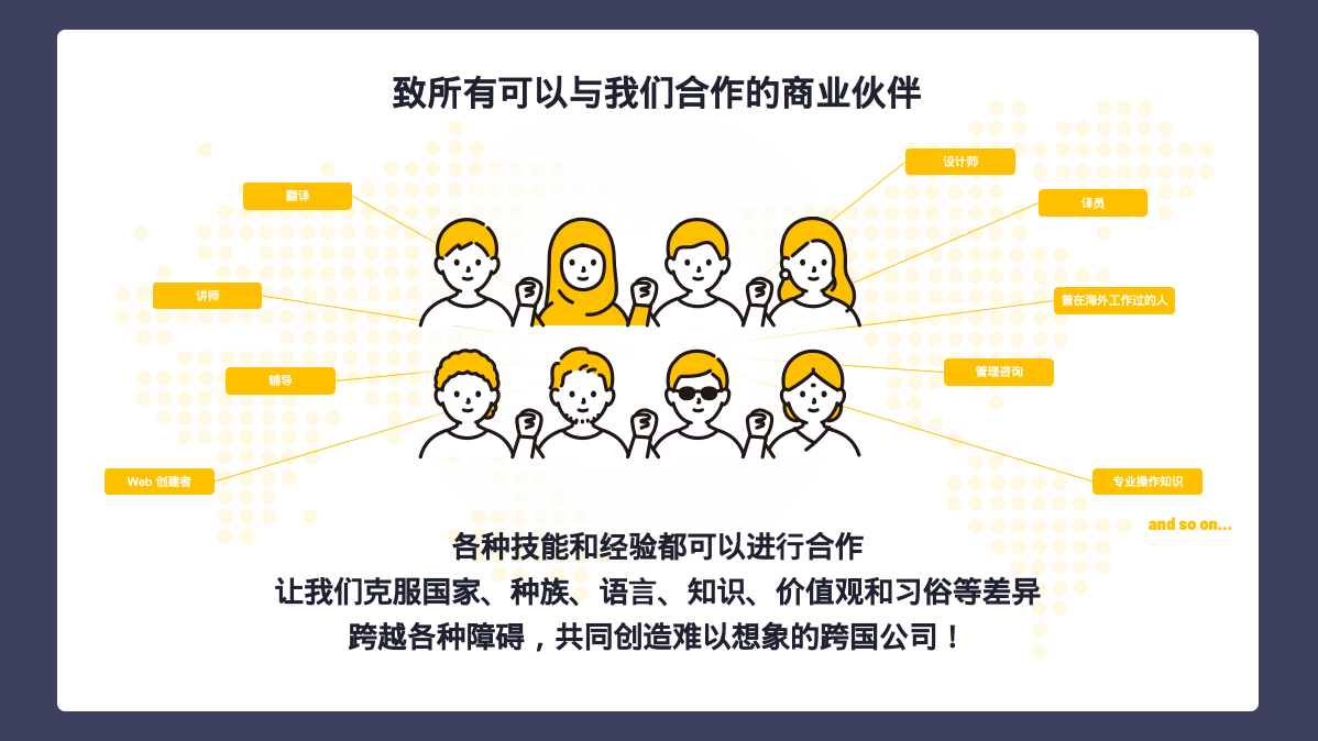 让我们携手跨越国籍、种族、语言、习俗、价值观以及知识上的差异,共同打造一个多元化的跨国企业。 我们追求的不是通过剥削劳动力、竞争职位和待遇来实现个人利益的组织,而是一个能够分享管理挑战、将个人的工作成效直接转化为报酬、并且成员间互帮互助的健康组织。 如果您在特定领域拥有专长或丰富经验,我们诚邀您加入我们,用您的才能支持亚洲的年轻创业者和中小企业。