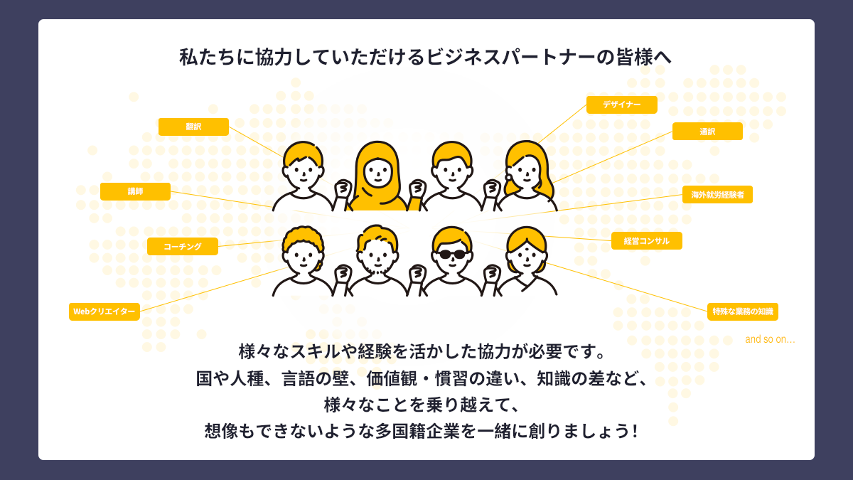 国や人種、言語の壁、慣習の違い、価値観の違い、知識の差など、いろいろなことを乗り越えて、 一緒に多国籍企業を創りましょう。
