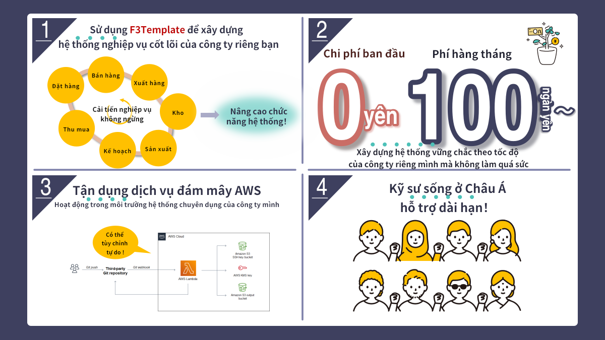 Chúng tôi phát triển các chức năng hệ thống cần thiết cho ngành sản xuất như là đặt hàng, thu mua, kế hoạch, sản xuất, kho, xuất hàng, bán hàng, v.v... giống như gói phần mềm gọi là F3Template. F3Template không thể giữ nguyên mà vận dụng được. Nó cần phải được tùy chỉnh theo yêu cầu của công ty bạn.